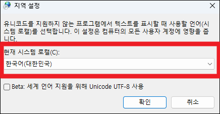 👉 UTF-8 베타 옵션부터 끄고 재부팅해보자.